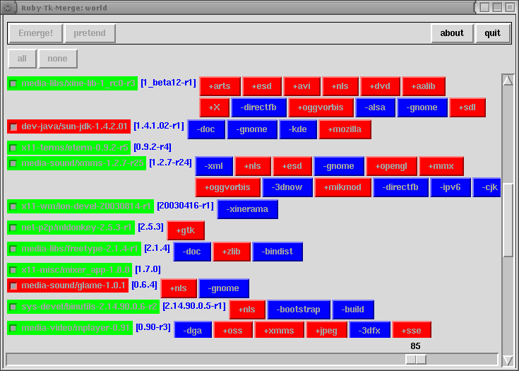 2003-08-07: Version 0.5 has been released. Among other changes a progressbar for the individual package has been added. In fact it existed in the previous version as well but it was turned off by default. This one is rewritten and works so good that it has been turned on by default. 'So good' does not mean you can trust it, but it means it doesn't break anything. Right now I use a method which simply approximates the compile time to be as much as the last time you compiled that program. This is done with help of a script called 'splat', which you'll have to merge. Screenshot at bottom of the page